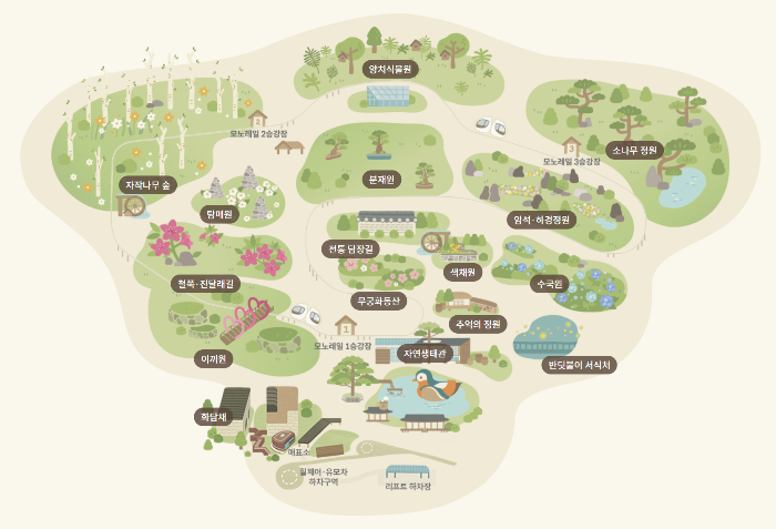 - 분재정원: 약 250여 종의 분재가 전시된 정원으로, 정교하게 가꿔진 나무들이 예술적 감동을 선사합니다.