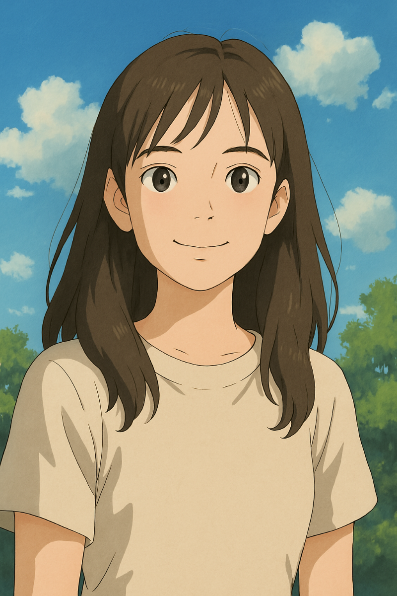"이 사진을 스튜디오 지브리 스타일의 일러스트로 변환해 주세요. 내 얼굴 특징이 인식될 수 있도록 유지하면서, 부드럽고 회화적인 느낌을 적용해 주세요. 따뜻한 색감과 손으로 그린 듯한 질감을 사용하고, 파스텔톤 색상을 활용해 주세요. 배경은 따뜻한 햇살과 부드러운 바람이 부는 평화로운 시골 풍경으로 만들어 주세요."