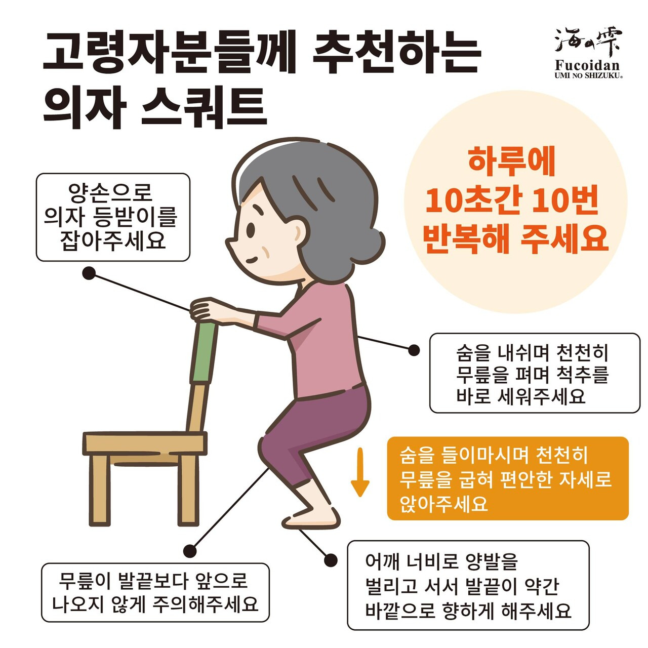 - 종아리 둘레 측정: 남성은 34cm, 여성은 33cm 미만일 경우 근감소증의 가능성이 있습니다.